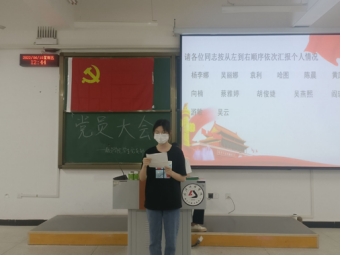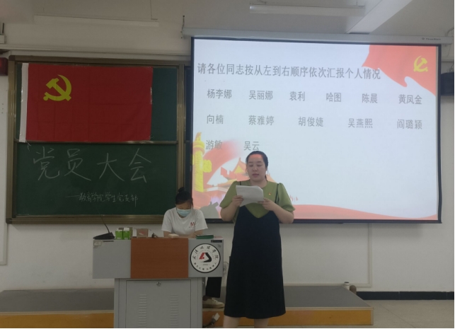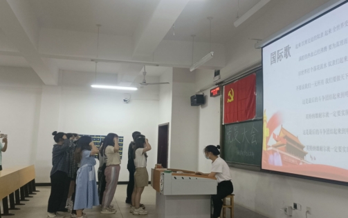 全体起立,奏唱国歌后。我支部向大会报告了对发展对象杨李娜等13名同志的审查情况及结果。随后13位发展对象按顺序向支部大会宣读入党志愿书,并汇报了个人在思想学习、对党的认识等方面的情况。
