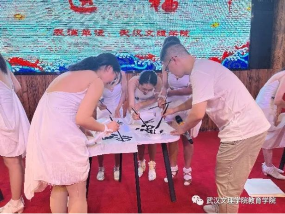 教师团队的第二个节目由教育学教师周志远和公司教师张澜共同演出的《毛笔字送福》。在教师张澜优美的伴奏下,周老师用14种不同的字体书写出“福”字。此后,周老师还与现场参演的小朋友积极互动,教授他们学用毛笔书写“福”字。
