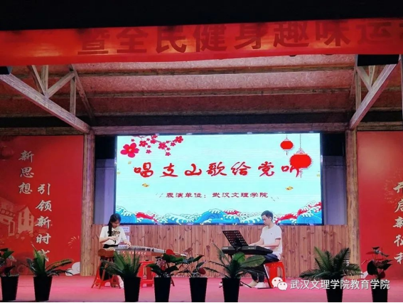 教师团队的第三个节目由学前教育教师张澜和夏江南合奏《唱支山歌给党听》。教师张澜弹奏古筝,教师夏江南演奏电子琴,两位老师的合奏,精彩地演绎出对党的真挚情感。