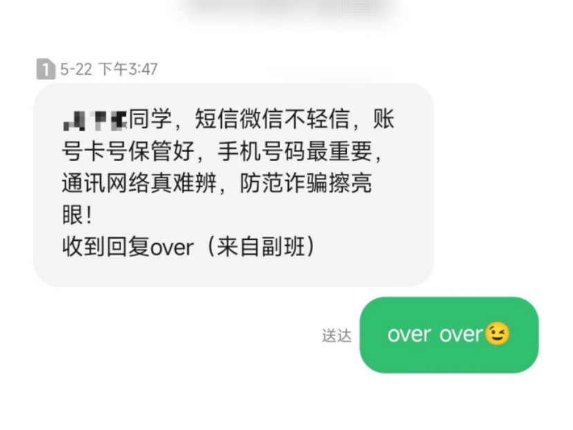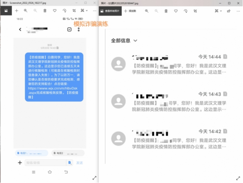 为了测试学子们的防诈骗意识,yl23455永利开展了“诈骗演习”,模拟骗子的诈骗手法,随机给同学们发送诈骗短信。