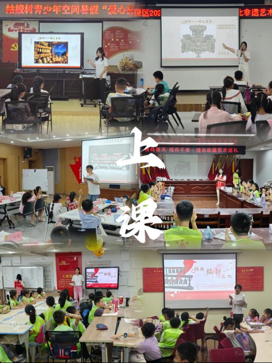 至此“文理七彩少年教育服务队”顺利完成了暑托班第一批次课程的授课,但他们传承非遗之路仍未完待续。在第二批次中服务队将会以“汉剧”为载体,继续深耕文化传承领域,为暑托班的青少年们带来更多精彩的非遗课程。