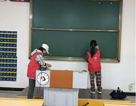 活动过程中,志愿者们耐心且细致地擦拭粉笔灰,清理讲台桌面,检查教室卫生。经过两个小时的辛勤劳动,志愿者们以默契的配合与高效协作,使教学楼环境焕然一新,为师生营造了更加整洁的学习环境。