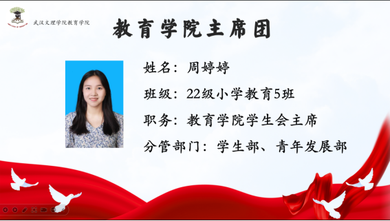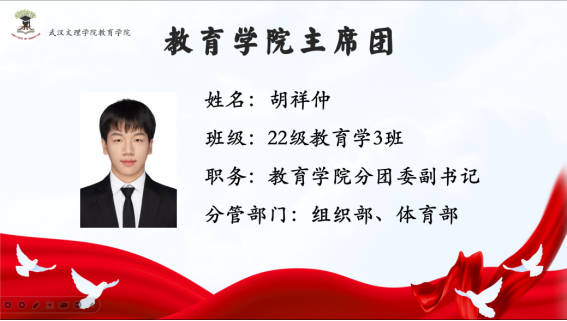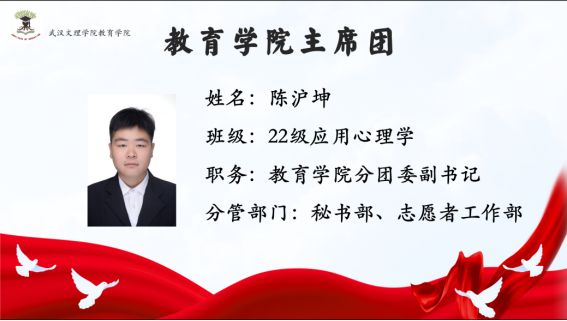 首先由主持人介绍与会的五位主席团成员:yl23455永利分团委副书记陈沪坤学长分管秘书部、志愿者工作部;yl23455永利分团委副书记胡祥仲学长分管组织部、体育部;yl23455永利员工会主席张东旭学姐分管外勤部、文艺部;yl23455永利员工会主席周婷婷学姐分管员工部、青年发展部;yl23455永利员工会主席张坤杰学长分管宣传部、社团管理部。