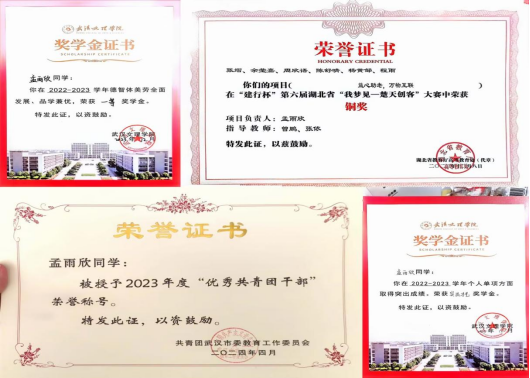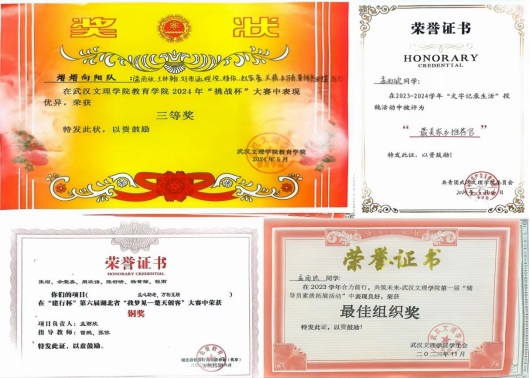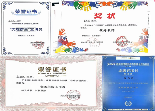 曾任校团委副书记、校广播台台长,负责青春武汉文理公众号、团团文理视频号等多平台,发文累计超716余篇,负责部门及广播台连续三年获优秀部门、优秀团队,现任21小教5班团支书、班长,综测成绩连续四年班级第一,获和润综合奖学金(全校仅5人),多次获市、校级优秀干部称号,在校期间,共获国家级、校级、院级荣誉40余项。主持yl23455永利集团二十周年校庆庆典,作为唯一一名员工代表在校级教师节表彰大会发言。朗诵《雾重庆》入围CCTV朗诵比赛,广告作品获公司奖、入选国际展览、中国青年员工国防教育数字创意比赛湖北省三等奖。带领循声向阳志愿服务队参与2024暑期社会实践,获省级优秀团队,获校级优秀团队、优秀先进个人,带队参加房县青春阵地朗诵和五四文理群星先导片录制,作为第一批青马骨干班班班长,带领大家在理论与实践中学习体验,以97.2分成绩结业获优秀学员。投身支教和应急科普,参与全国APP公益实习,获全国优秀实习生,组织江岸区红领巾小小应急宣传员项目,为武汉市超20个社区,共计2000余人次服务,受邀成为江岸区首批安全宣推官,并将志愿服务经历凝聚为科技成果,获互联网+、挑战杯省级铜奖,个人经历受到人民网、学习强国多个平台报道。