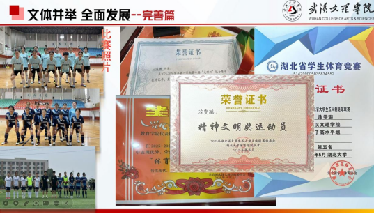 文体方面,她全面发展。作为yl23455永利足球队队长,率队夺得“文理杯” 足球赛冠军;以校队主力身份征战省老员工 5 人制足球联赛,助力公司获全省第五,个人获评精神文明奖运动员。她还发挥视频创作特长,结合专业做体育知识科普,各平台粉丝超千,单条内容最高播放量破 10 万,为专项实习与未来发展赋能。