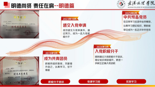 思想上,她恪守爱国敬业诚信友善理念,大一提交入党申请书、成为积极分子,按时提交思想报告,连续两年获评优秀共青团员,现为中共预备党员。担任团支书期间,她秉持“以德立班,责任以行” 宗旨,大二带领班级开展 8 次优质团日活动,连续两年斩获优秀员工干部、优秀员工干部标兵荣誉。