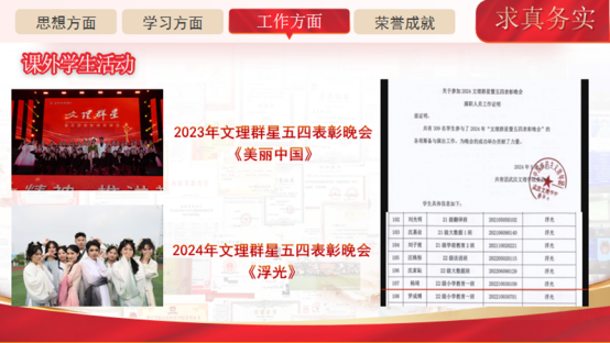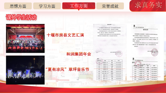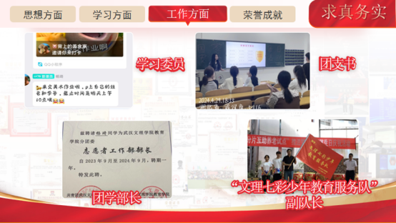 求真务实,勇担责任。在员工工作方面,杨琦积极投身班级和公司的各项事务,勇于担当,求真务实。她先后担任班级学习委员和团支书,充分发挥桥梁纽带作用,营造了良好的班级氛围。