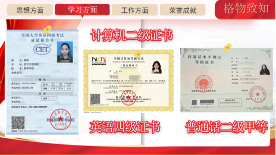 除此之外她还积极参加各类能力提升考试,目前已获得英语四级、全国计算机等级考试二级、普通话二级甲等证书。