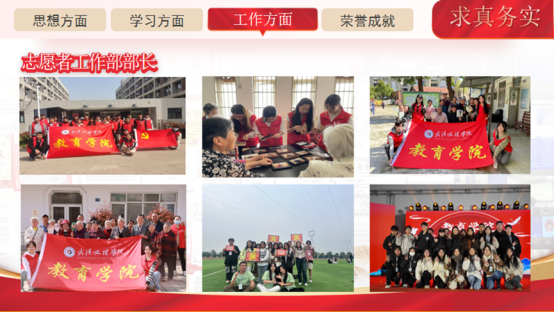 她热衷于志愿服务,将服务他人、回馈社会作为行动准则。大学期间,她参与了“七程彩假期”暑期社会实践活动、武汉空港半马拉松志愿服务、抗击疫情志愿服务等,累计参加志愿服务近百次,服务人数近千人次,志愿时长近500小时。