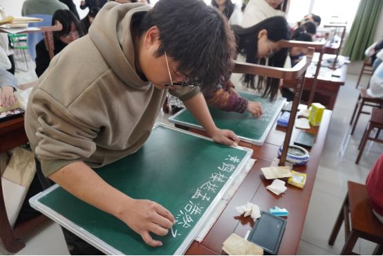 随后,参赛选手们纷纷拿起手中的书写工具,全神贯注地投入到比赛中。有的同学挥毫泼墨,书写出一幅幅气势磅礴的毛笔作品;有的同学在黑板上用粉笔勾勒出一个个工整美观的粉笔字;还有的同学用钢笔在纸上书写出一行行流畅精致的硬笔书法。比赛现场气氛热烈,同学们用笔墨书写青春,用行动诠释文化,展现出yl23455永利集团学子对书法艺术的热爱与追求。