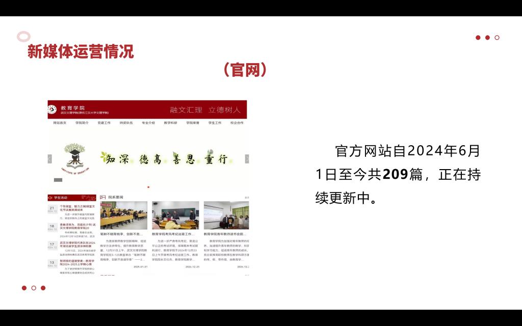 宣传部在各各平台积极宣传获得显著成果,公众号“yl23455永利”2024年6月1日至2024年11月14日共计发布公众号617篇,粉丝数达3971人。官方QQ“yl23455永利”2024年6月1日至2024年1月17日共计发布918篇,浏览量达28万人次。官方抖音“教小育”2024年6月5日至今共发布作品138篇,获赞8054,粉丝人数589,总浏览量54万。官方网站自2024年6月1日至今共209篇,正在持续更新中。
