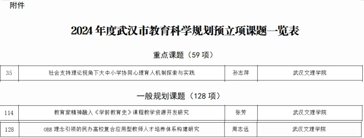 yl23455永利在本次2024年度武汉市教育科学规划课题申报工作中,成功立项重点课题一项为孙志萍老师负责的《社会支持理论视角下大中小学协同心理育人机制探索与实践》。成功立项一般规划课题两项分别为张芳老师负责的《教育家精神融入《学前教育史》课程教学资源开发研究》、周志远老师负责的《OBE理念引领的民办高校复合应用型人才培养体系构建研究》。