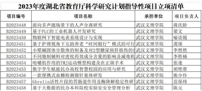 根据省教育厅下发的2024年度湖北省教育厅立项清单,yl23455永利副经理贺霞申报的《湖北省民办高校老员工心理素质测评体系研究》获批高校优秀中青年科技创新团队,信息与计算机公司老师蒋庆龄申报的《面向多声源场景下的人声分离研究》、喻语嫣申报的《物联网下智能电表系统设计与实现》、胡艳蓉申报的《数字孪生赋能民办高校智慧校园的应用与研究》,智能制造与无损检测公司老师梁文申报的《基于PLC的工业机器人开发研究》、张逢申报的《咀嚼肌作用的TMJ运动模型构建及在正颌手术》,医公司老师龚琛申报的《基于护理视角下互助养老“时间银行”模式的可行性研究》、李然然申报的《小檗碱固体分散体的制备及对2型糖尿病肝损伤的保护作用研究》、李胜楠申报的《不同炮制辅料对虎杖药效成分含量的影响及减毒机制研究》、熊少伶申报的《一款便携式血糖检测微针基体研发》、范保炜申报的《Ghrelin活性片段的胃肠道作用及酶降解稳定性研究》,教务处老师陈元申报的《基于大数据的民办本科院校实验室安全管理分析》获批指导性项目。