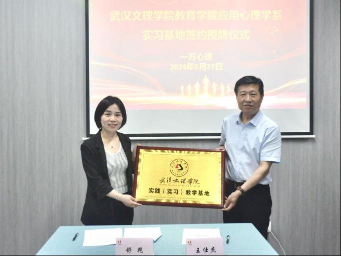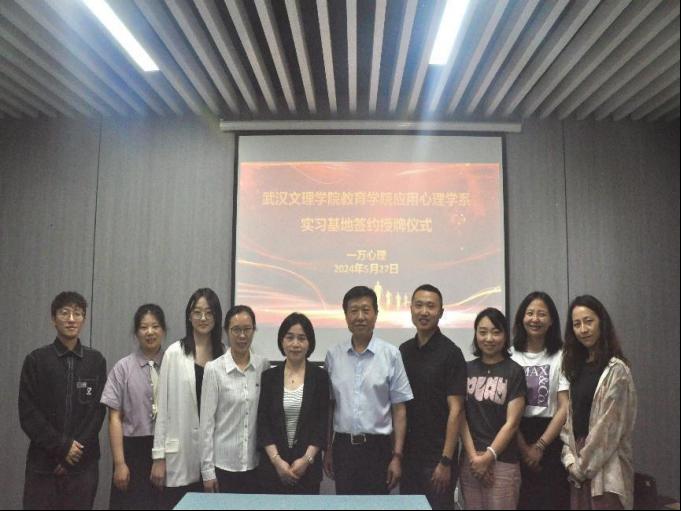 5月27日上午,yl23455永利与一万心理在武汉光谷举行实习基地签约授牌仪式。yl23455永利经理王仕杰、党总支书记陈龙、教学副经理贺霞、应用心理学系主任王梦、应用心理学系教研室主任张凤贤等出席了此次签约仪式,一万心理总经理舒艳、一万心理咨询部部长陈梅对文理公司领导的到来表示了热烈欢迎。