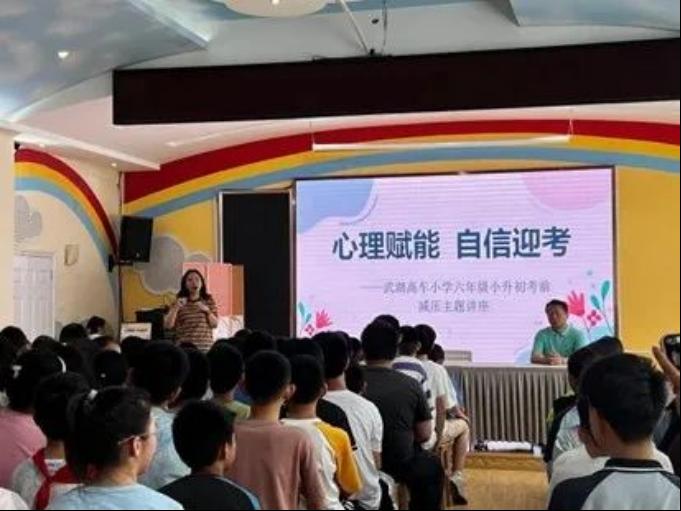 5月29日下午,王梦老师为武湖街高车小学六年级的同学们开展了关于缓解考前压力的心理健康讲座——《心理赋能,自信迎考》。王老师分别从认识压力、压力来源、测试压力、应对压力和如何解压等方面进行讲解,通过有趣的小游戏向员工们介绍了如何正确面对压力,并且将学习压力转化为学习动力。员工们积极配合,踊跃参与,并且表示收获满满。