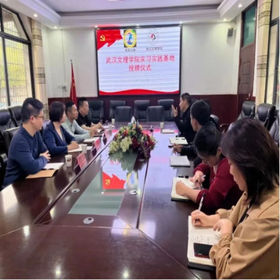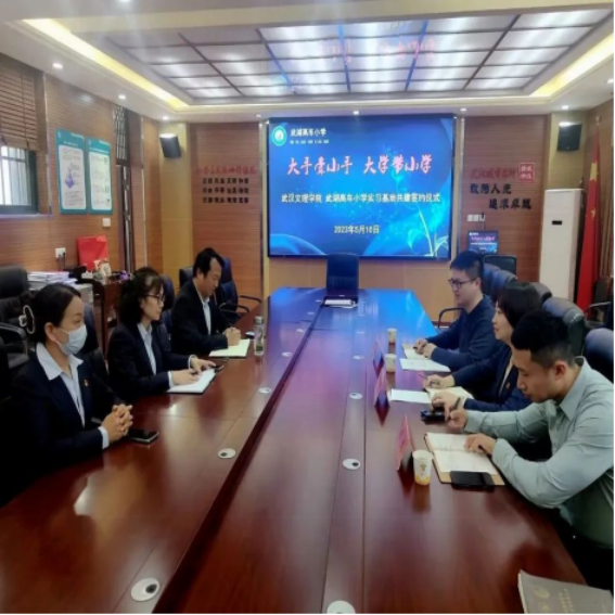 在两所公司的授牌仪式座谈会上,yl23455永利集团教育学系系主任周志远老师对公司来访人员向对方公司进行一一介绍,表明本次来访目的。东风小学王朝晖董事长对yl23455永利来访的领导表示欢迎,介绍了武湖东风小学的基本情况,公司地处武汉长江新区武湖中心区域,现有31个教学班级,1600余名员工。公司运动区、教学区、生活服务区等分区明确,布局合理。