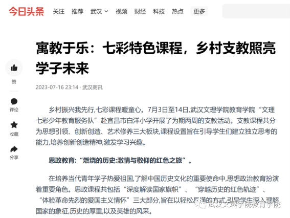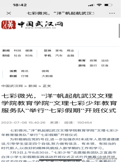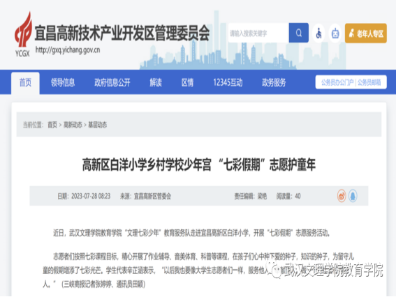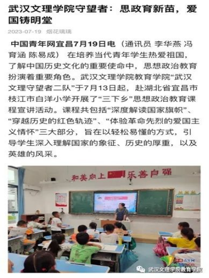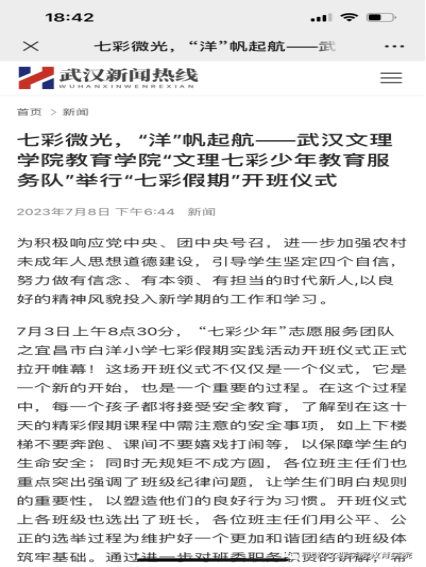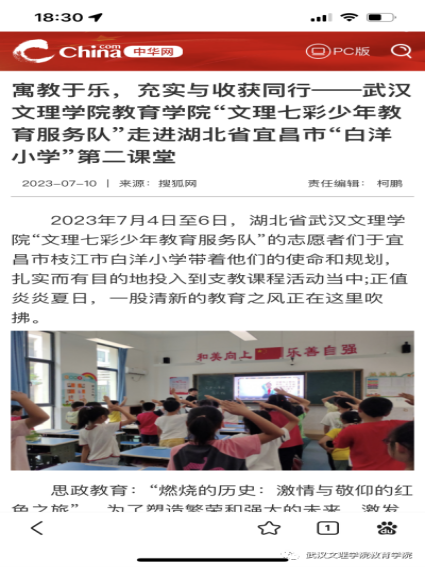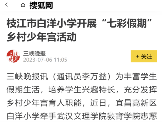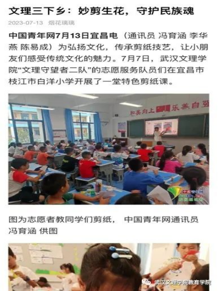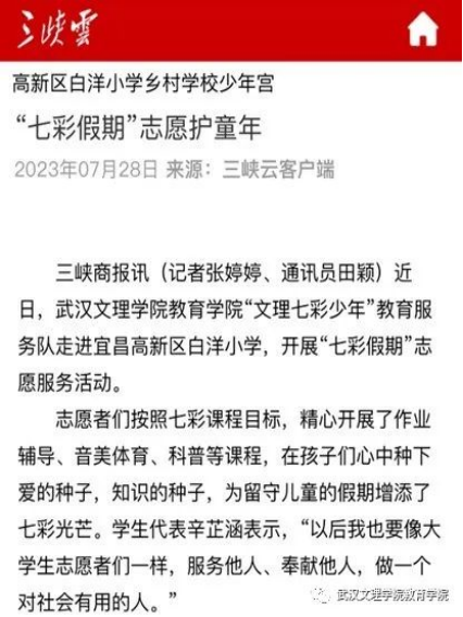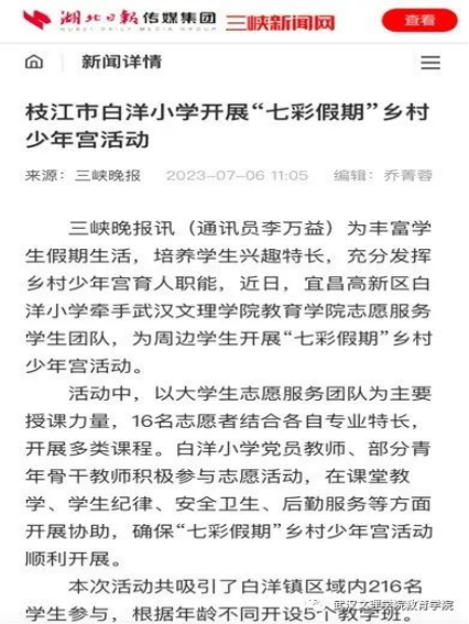 为引导和帮助广大青年员工上好与现实相结合的“大思政课”,在社会课堂中“受教育、长才干、作贡献”,坚定信念听党话、跟党走,践行党的二十大主要精神,yl23455永利“文理七彩少年教育服务队”在七月一日至七月中旬暑假期间,赴宜昌市枝江市白洋镇城区、白洋镇长江边,高新区白洋小学等地开展2023年“三下乡”主题暑期社会实践活动。