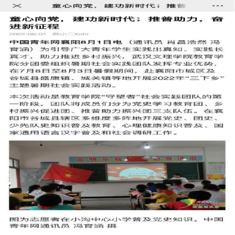 今年暑假,公司首次组织参加团中央、湖北团省委举办的“ 七彩假期”关心关爱留守儿童暑期志愿服务活动,为了确保活动顺利开展,充分展现文理学子风貌,公司“ 七彩少年”团队立即挑选出一批不同领域专业的精兵强将组成先锋队,成员们分别从新疆、黑龙江、安徽以及湖北各地汇聚至襄阳市谷城县盛康镇开始为期近一个月的“三下乡”“七彩假期” 之行。